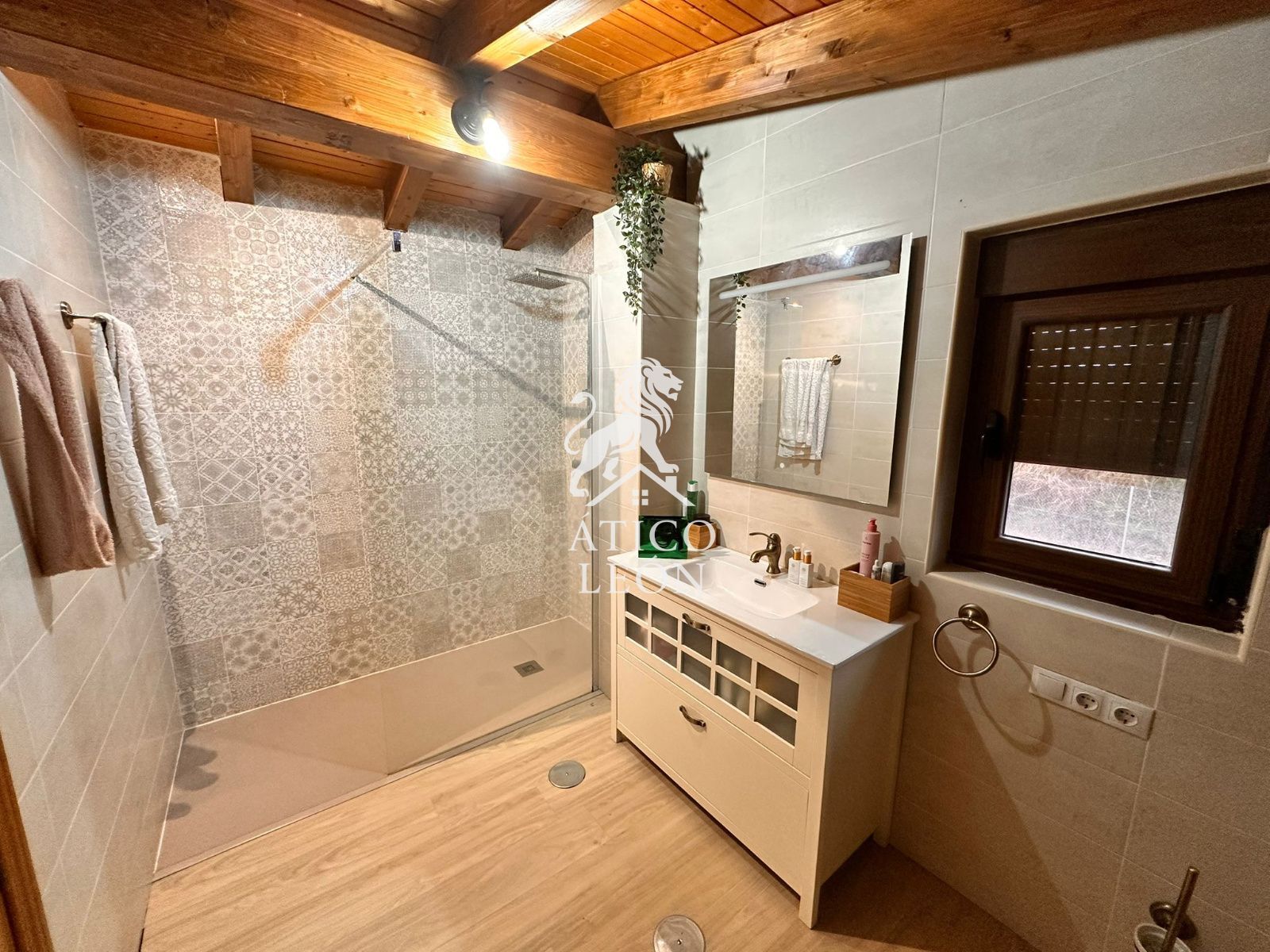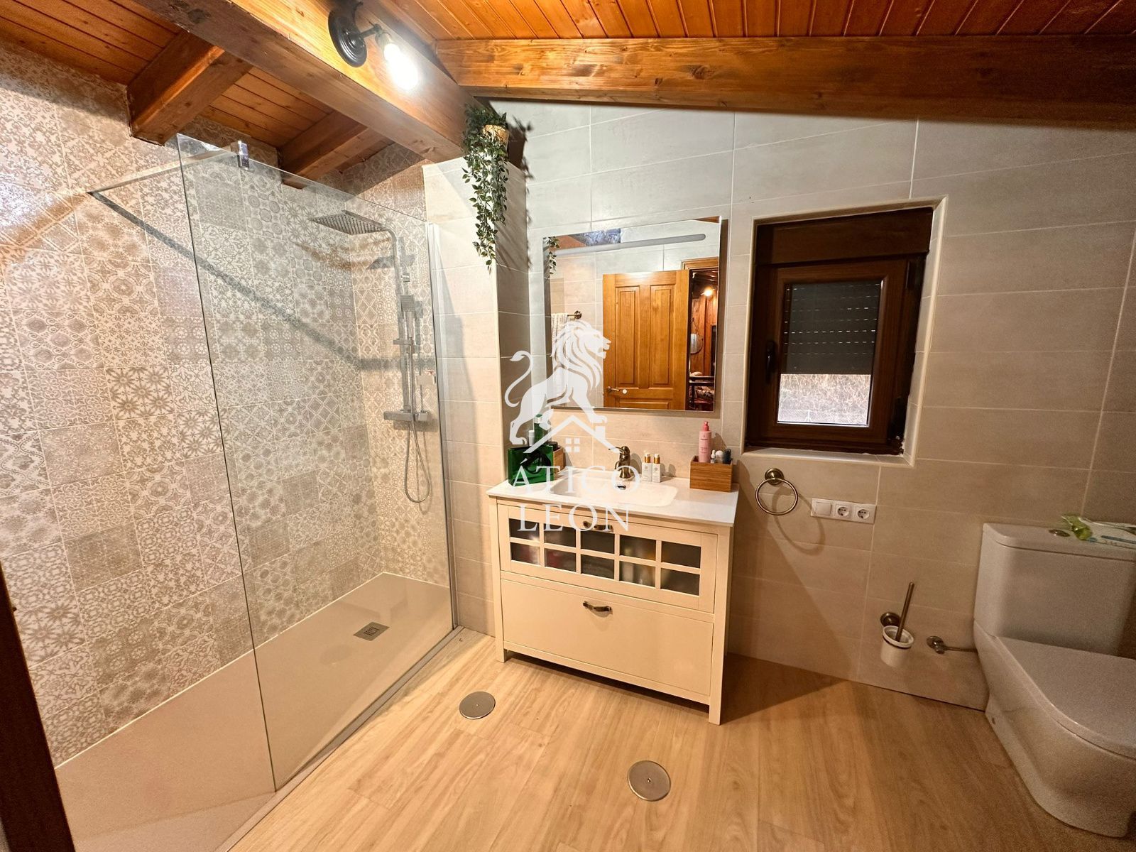 En la planta baja encontramos una gran cocina, de diseño moderno y funcional, perfecta para el día a día, un acogedor salón con chimenea que aporta calidez a toda la vivienda, dos amplios dormitorios y un cuarto de baño completo con cabina de hidromasaje.